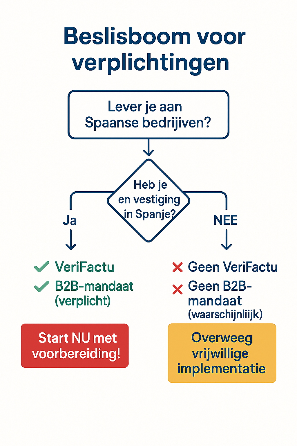 Voor Nederlandse bedrijven die aan Spaanse klanten leveren roept dit fundamentele vragen op: vallen wij onder deze verplichtingen? En zo ja, onder welke? Of onder beide?