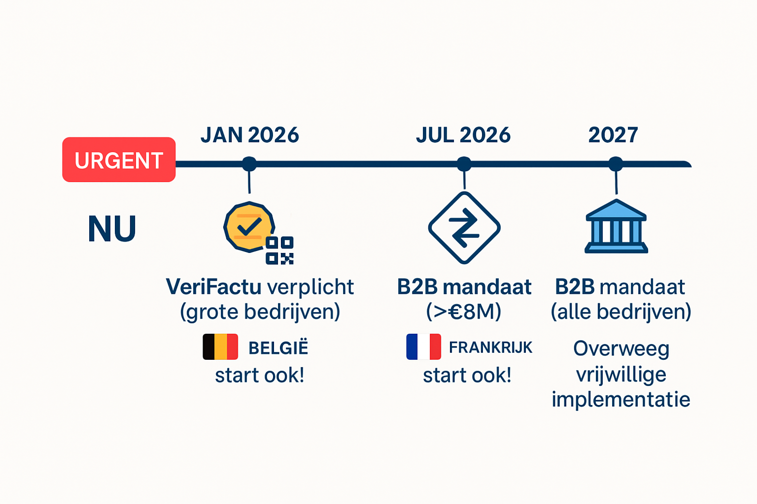 Want hier zit het cruciale verschil: waar België kiest voor één helder Peppol-gebaseerd systeem, introduceert Spanje twee verschillende systemen die naast elkaar opereren. Royal Decree 1007/2023 introduceert VeriFactu (vereisten voor factureringssoftware) dat al over twee maanden ingaat, terwijl de “Crea y Crece” wet de basis legt voor een later B2B e-facturatie mandaat (2027/2028). Deze dubbele aanpak, gecombineerd met de korte tijdlijn en de parallelle implementatie met België, creëert urgentie én verwarring – vooral voor internationale handelspartners die nu voor beide landen tegelijk moeten begrijpen wat er van hen verwacht wordt.